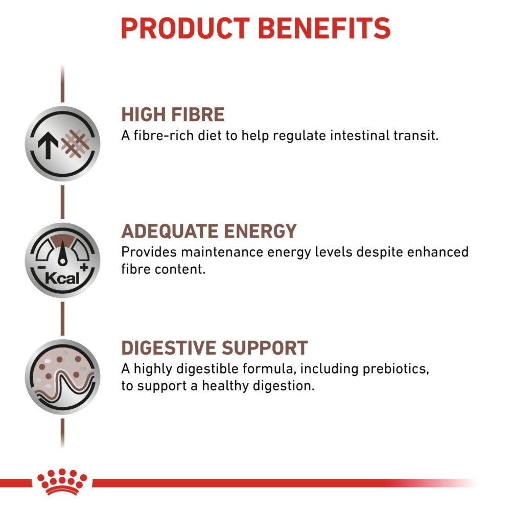 ROYAL CANIN Gastrointestinal High Fibre is specifically formulated to help support your dogs digestive health in cases of gastrointestinal sensitivities. This fibre rich diet is formulated with an optimal blend of fibres to help both regulate and support intestinal transit. Despite the high fibre content, this diet is formulated to provide maintenance energy levels.